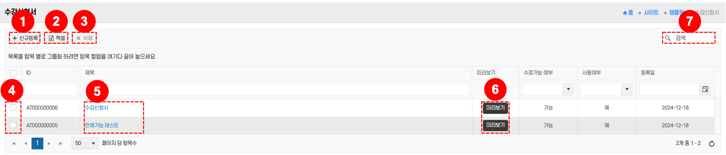 • 신규등록: 상단의 신규등록 버튼 ①을 클릭 → 수강신청서를 작성한다.
