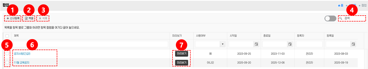 - 팝업 삭제: 체크박스 ⑤로 항목 선택 → 삭제 버튼 ③ 클릭 → 선택한 팝업 제거.