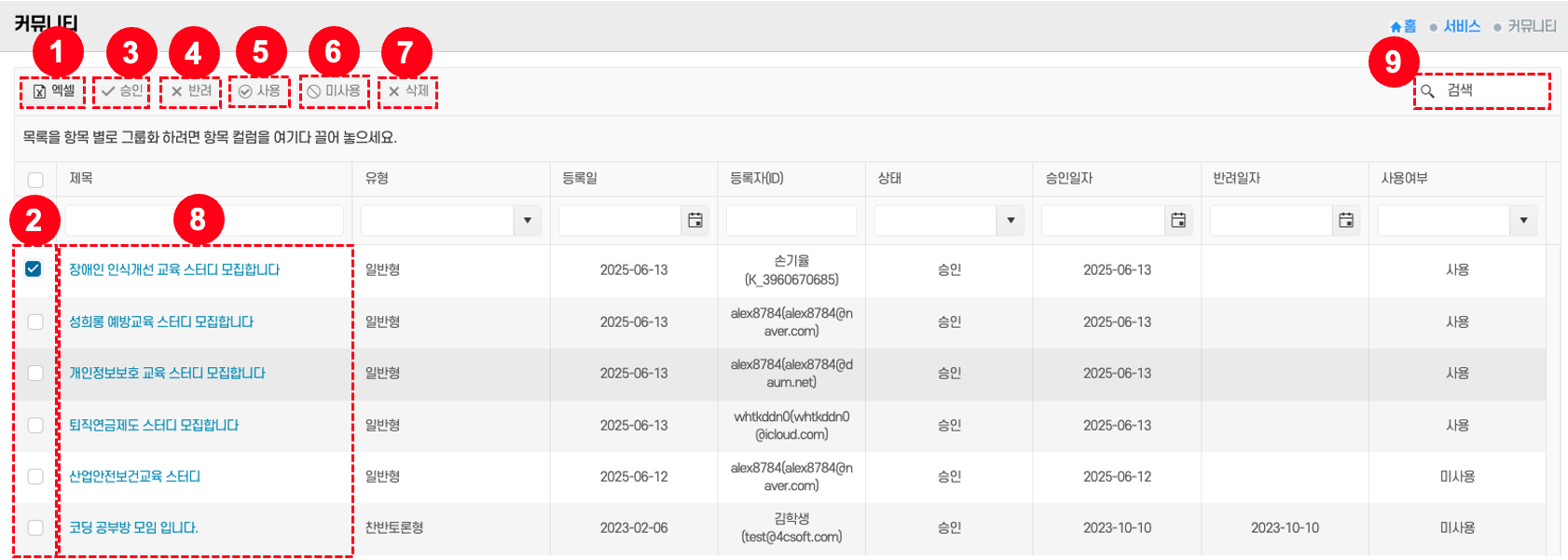 - 반려: 반려할 글을 체크박스 ②로 선택 → 반려 버튼 ④ 클릭 → 반려 상태로 전환된다.