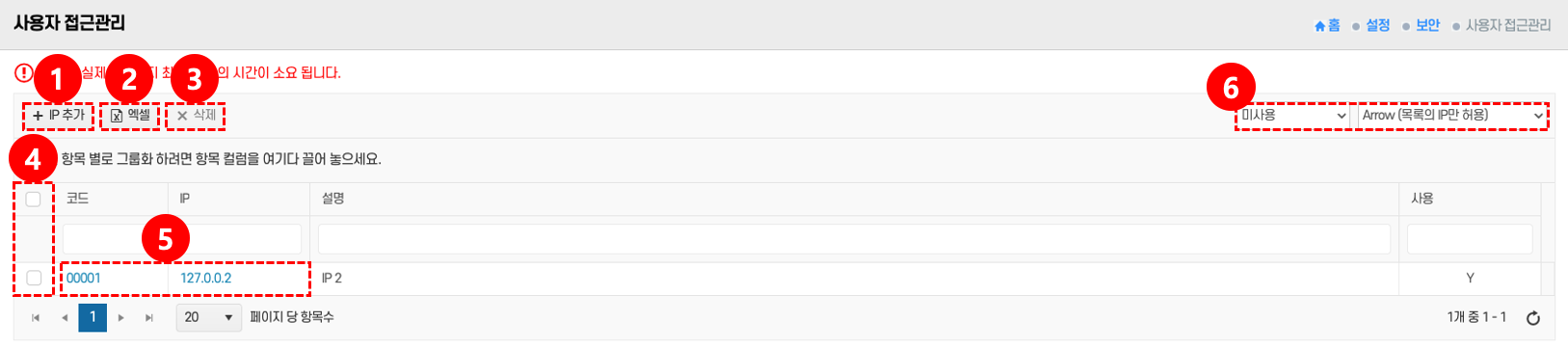 • 사용 여부: 드롭다운에서 사용 여부 ⑥ 선택 → 해당 IP의 접근 가능 상태를 설정한다.