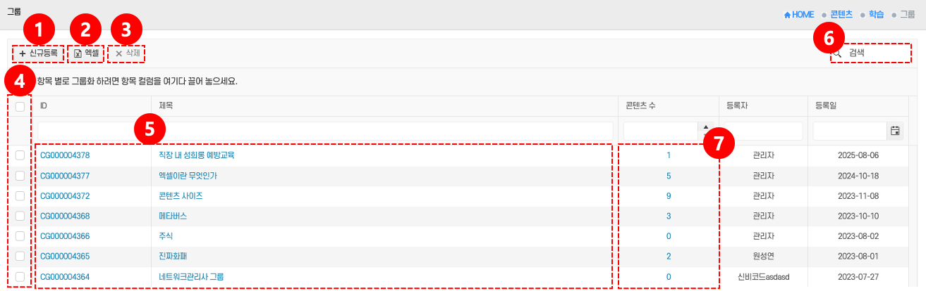 - 검색: 화면 우측 상단의 검색창 ⑥에 키워드를 입력 → 검색 버튼을 눌러 원하는 그룹을 조회한다.