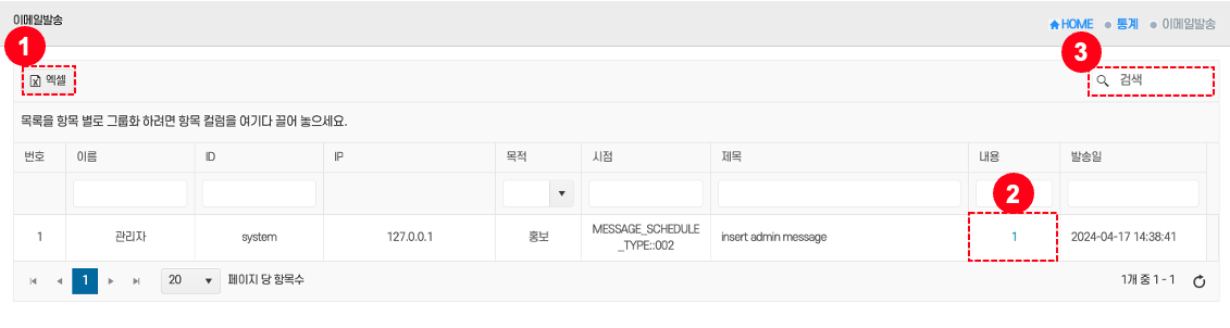 - 엑셀 다운로드: 상단의 엑셀 버튼 ① 클릭 → 현재 조회된 이메일 발송 내역을 엑셀 파일로 저장한다.