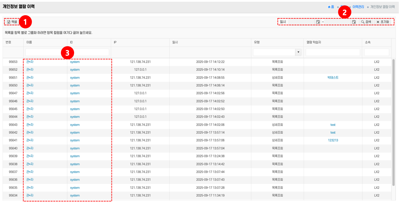 엑셀 다운로드: 상단의 엑셀 버튼 ①을 클릭 → 개인정보 열람 이력을 저장한다.