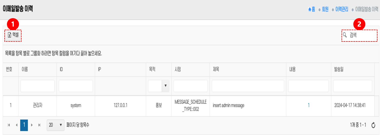 엑셀 다운로드: 상단의 엑셀 버튼 ①을 클릭 → 이메일 발송 이력을 저장한다.