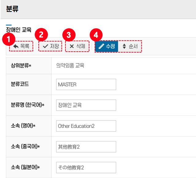 - 수정: 분류 항목을 편집하려면 수정 버튼④ 클릭 → 수정 가능 상태로 전환 후 원하는 내용을 변경한다.