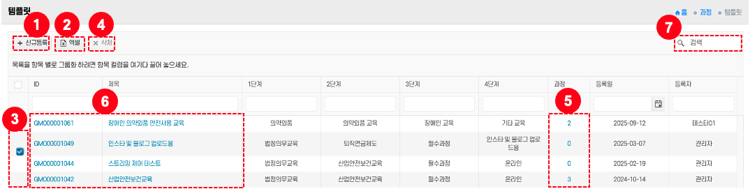 - 연결 과정 확인: 템플릿이 몇 개의 과정에 적용됐는지 보려면 과정 수 ⑤ 클릭 → 연결된 과정 목록 확인한다.