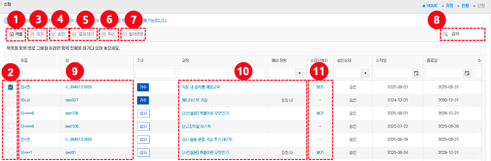 - 검색: 특정 신청 내역을 찾으려면 검색창 ⑧에 이름/ID/과정명 입력 → 조회한다.