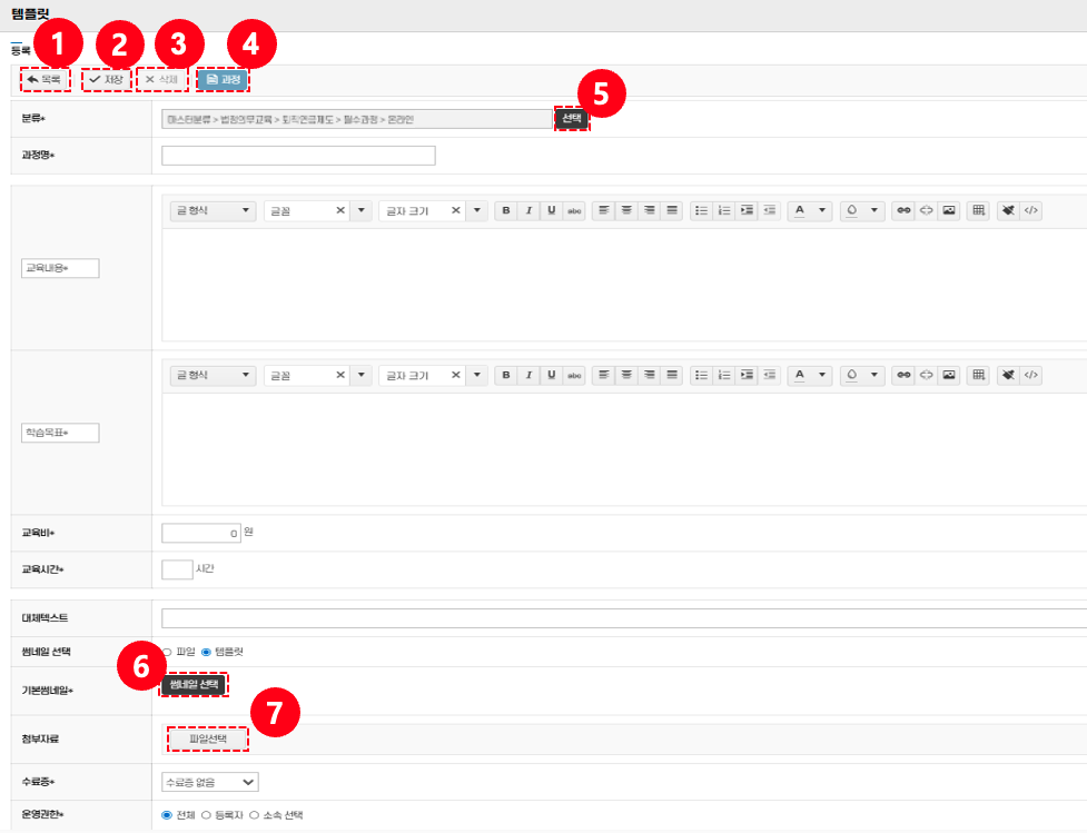• 과정: 템플릿과 연계된 과정을 관리하려면 과정 버튼④ 클릭 → 과정 관리 화면으로 이동한다.