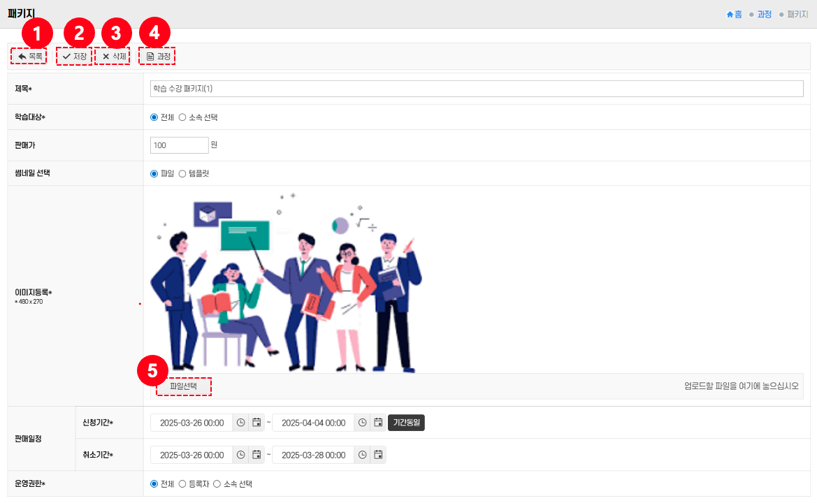 • 저장: 패키지 제목, 학습대상, 판매가, 이미지 등을 입력 후 저장 버튼② 클릭 → 신규/수정된 패키지가 등록된다.