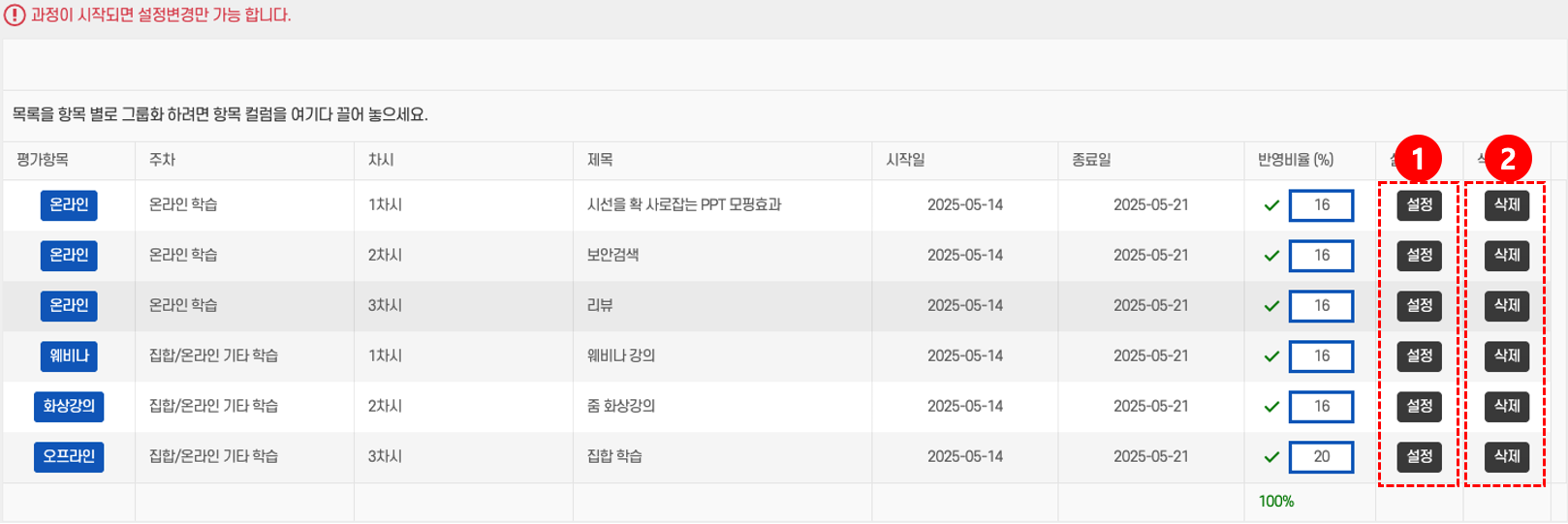 - 삭제: 필요 없는 차시를 제거하려면 삭제 버튼② 을 클릭하고 확인 창에서 ‘확인’을 선택한다.