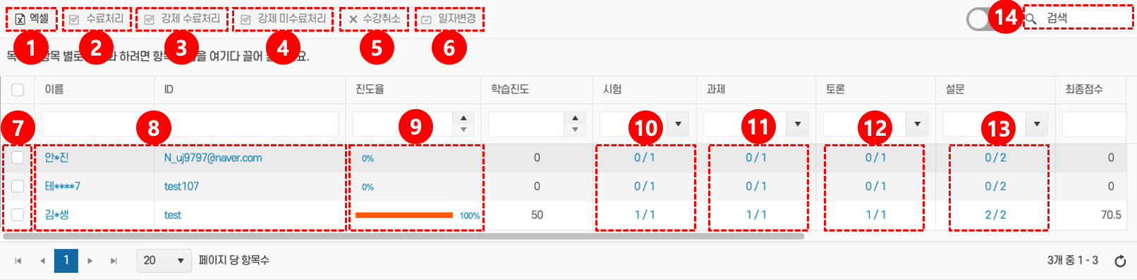 • 검색: 특정 학습자를 찾으려면 검색창⑭ 에 이름 또는 ID를 입력해 조회한다.