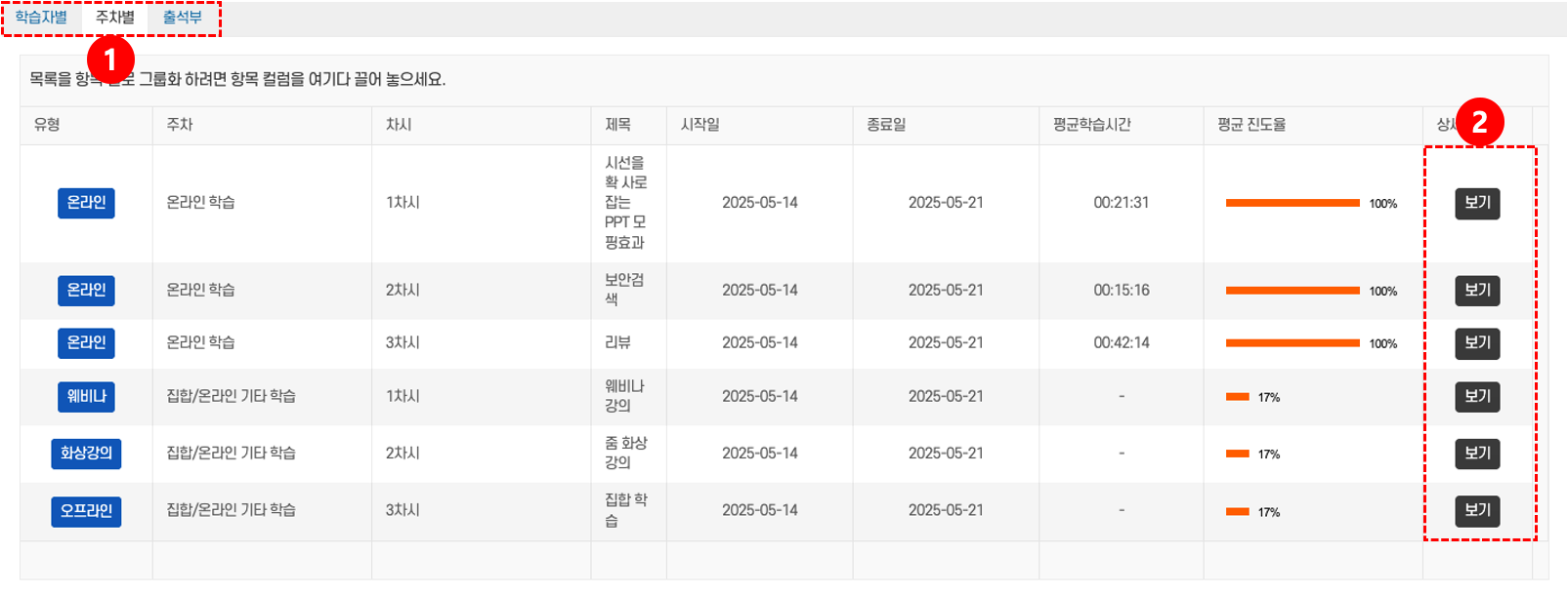 - 보기: 각 차시의 세부 데이터를 확인하려면 보기 버튼② 을 클릭해 학습시간과 진도율을 확인한다.