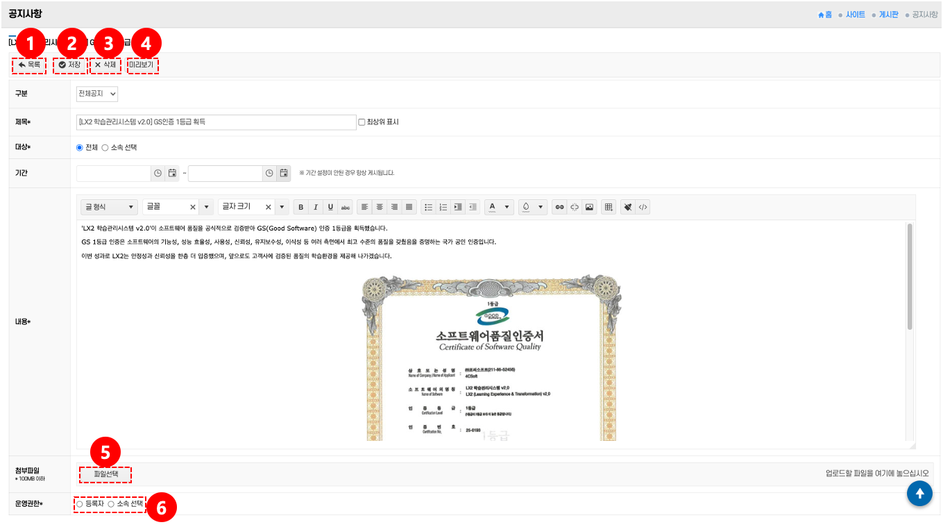- 공지 미리보기: 작성 완료 전 미리보기 버튼 ④ 클릭 → 실제 게시 화면 확인.