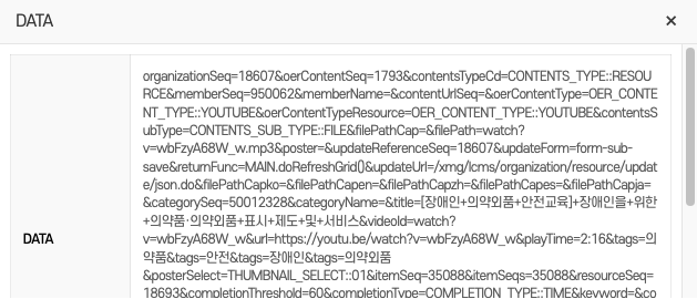 • DATA 버튼: 수정 이력 행의 DATA 버튼 ①을 클릭 → 팝업창을 연다.