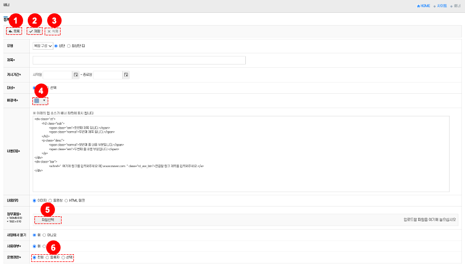 • 등록/저장: 등록 버튼 ⑥ 또는 저장 버튼을 클릭하여 배너를 등록한다.