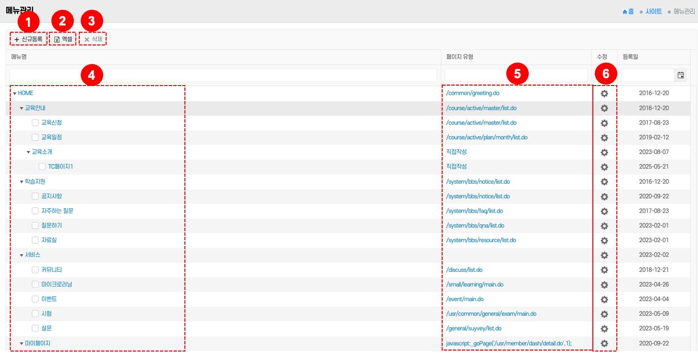 사이트의 메뉴명을 클릭하면 메뉴관리 화면능로 들어갈 수 있다.