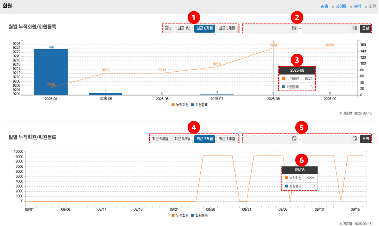 일별 통계 확인: 그래프의 데이터 포인트 ⑥을 확인 → 누적회원 및 회원등록 건수를 확인한다.