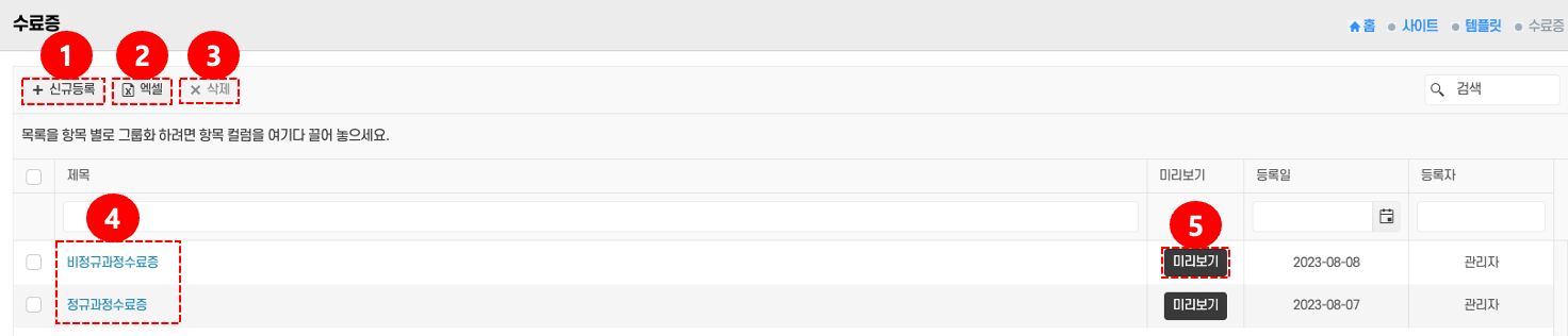 미리보기: 목록의 미리보기 버튼 ⑤를 클릭 → 발급 전 화면에서 수료증을 확인한다.