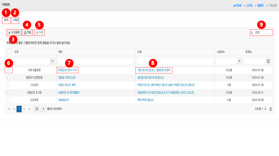 신규등록: 상단의 신규등록 버튼 ③을 클릭 → 새 자동알림을 등록한다.