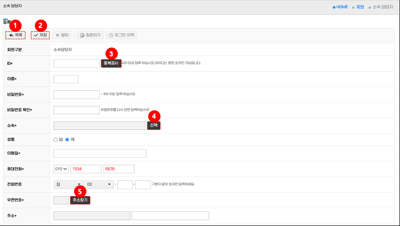 • 저장: 상단의 저장 버튼 ③을 클릭 → 신규 담당자를 등록한다.