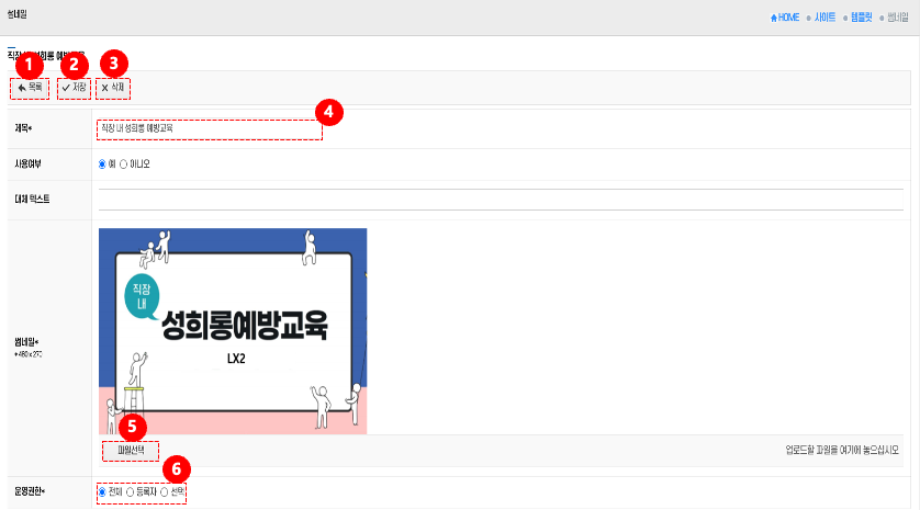 • 저장: 상단의 저장 버튼 ④을 클릭 → 신규 썸네일을 등록한다.