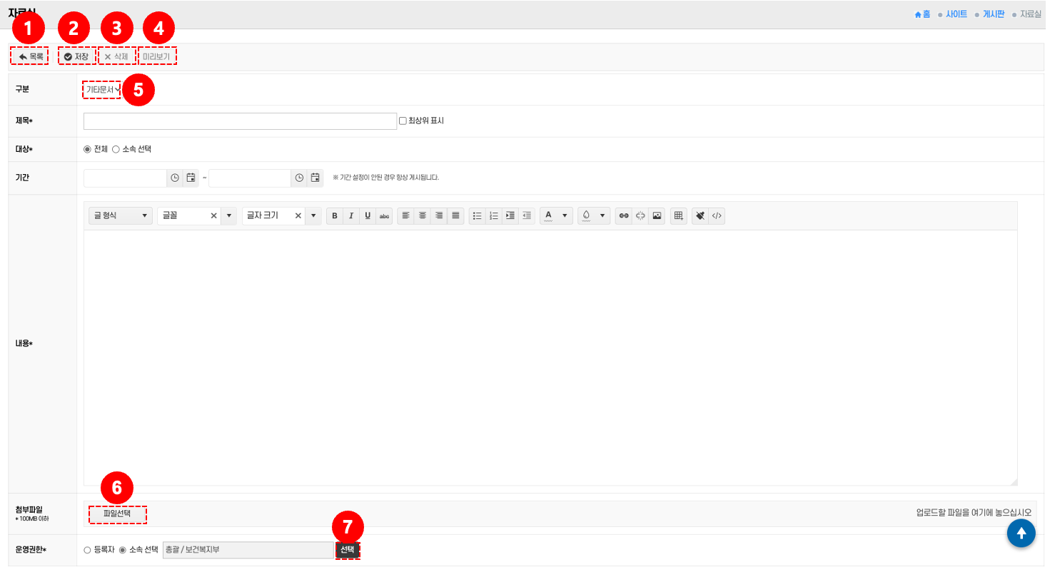 • 목록 이동: 상단의 목록 버튼 ⑦을 클릭 → 자료실 목록으로 이동한다.