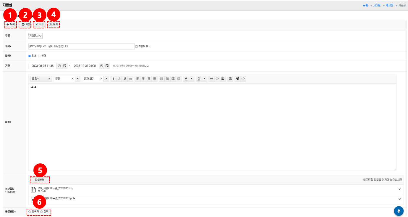 미리보기: 상단의 미리보기 버튼 ④를 클릭 → 등록 전 자료 내용을 검토한다.
