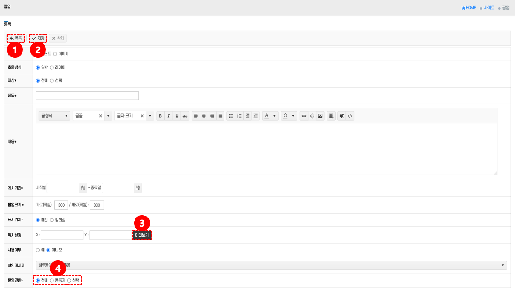 - 미리보기: 작성된 내용을 [미리보기] 버튼으로 실제 팝업처럼 확인할 수 있습니다.