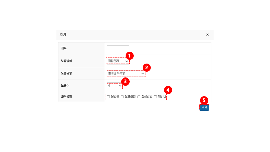 • 노출방식: 과정을 어떤 방식으로 관리할지 선택하려면 노출방식① 을 클릭하고 항목을 지정한다.
