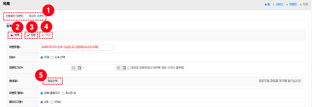 - 파일선택: 이벤트 대표 이미지를 추가하려면 파일선택 버튼⑤ 클릭 → 썸네일 이미지를 업로드한다.