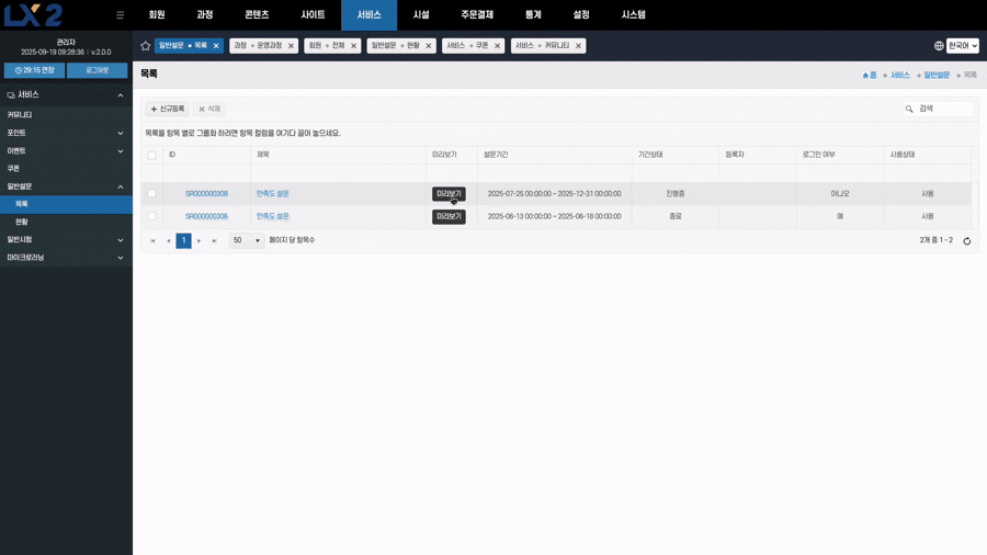 - 미리보기: 목록 화면에서 원하는 설문의 미리보기 버튼 클릭 → 해당 설문 화면이 팝업으로 열린다.