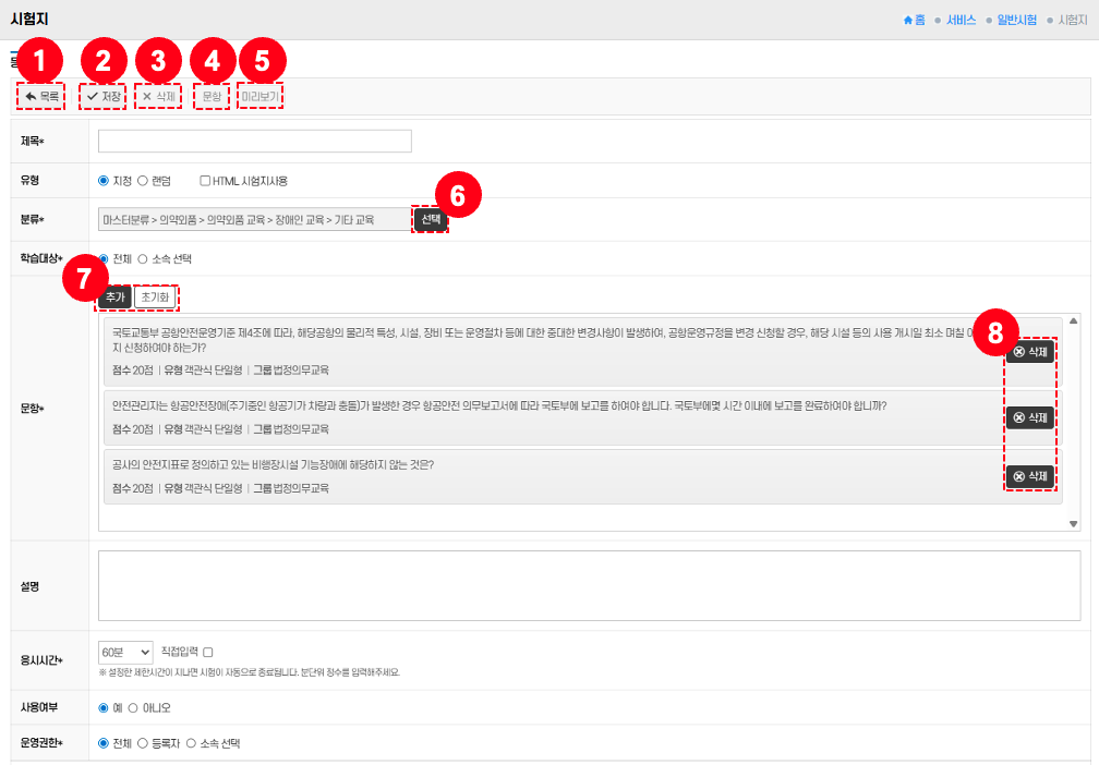 - 삭제(문항): 필요 없는 문항을 삭제하려면 해당 문항의 삭제 버튼⑧ 클릭 → 문항이 시험지에서 제거된다.