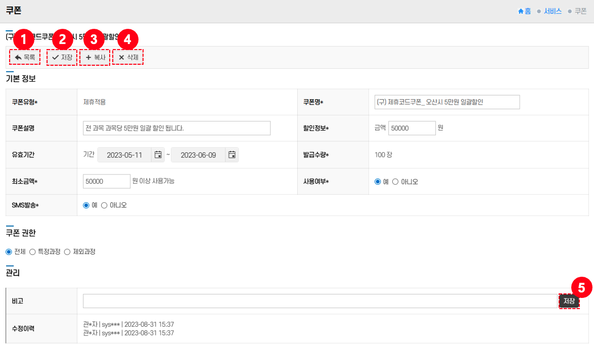 • 복사: 기존 쿠폰을 복제하려면 복사 버튼③ 클릭 → 동일한 설정값을 가진 새 쿠폰이 생성된다.