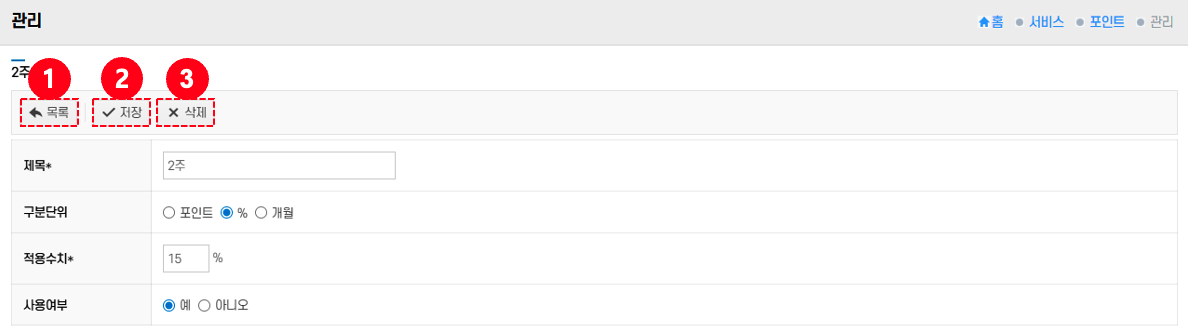 - 저장: 제목, 적용수치, 사용 여부를 입력한 뒤 저장 버튼② 클릭 → 설정이 저장된다.