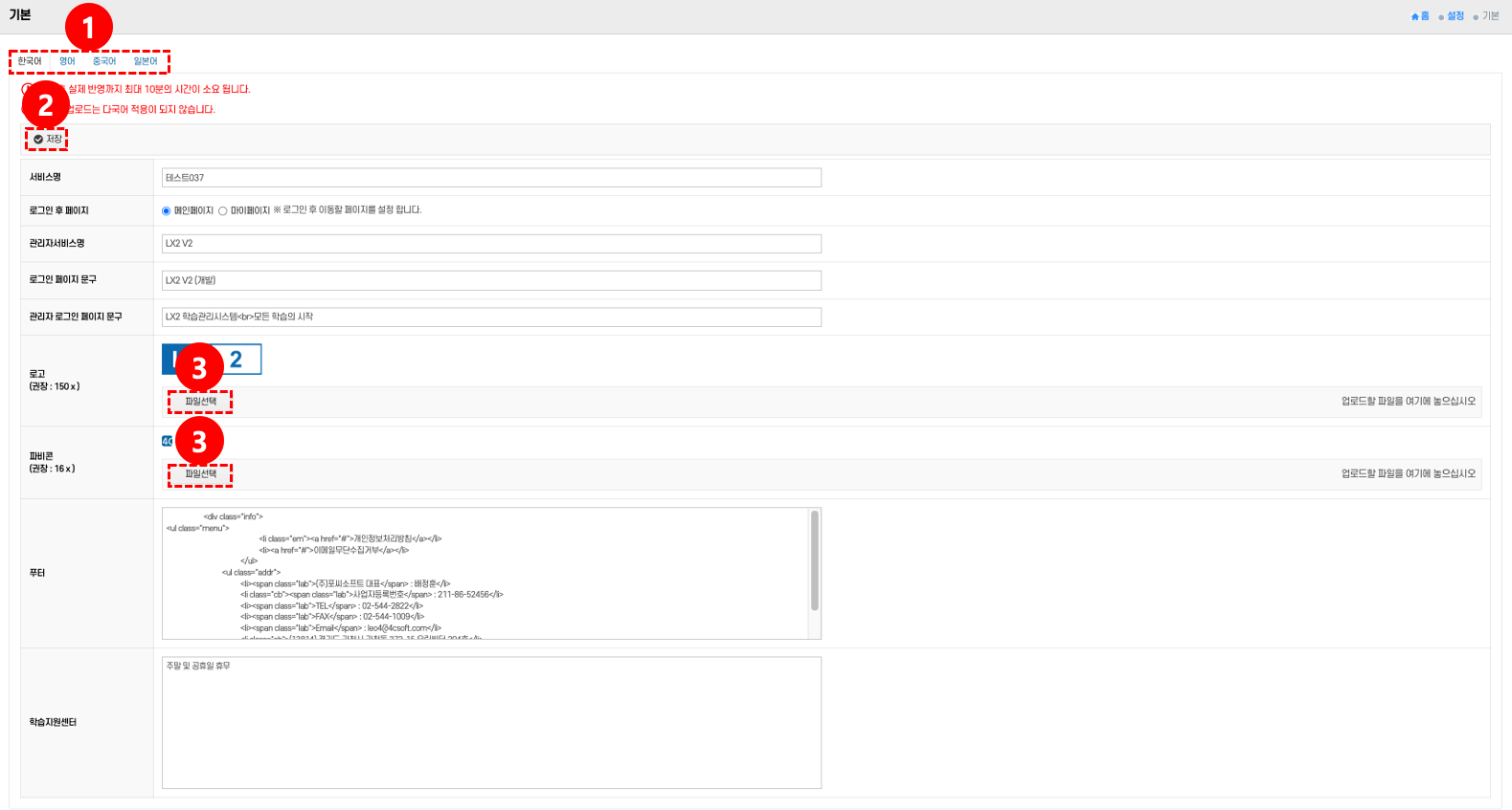 • 저장: 저장 버튼 ②을 클릭하면 서비스명, 로그인 페이지 문구, 로고, 푸터 등을 입력 또는 수정 → 저장 버튼 클릭 → 변경사항 반영된다. -파일 선택: 파일 선택 버튼 ③을 클릭하면 로고 또는 파비콘 업로드 영역에서 파일선택 버튼 클릭 → 로컬 PC에서 이미지 선택 → 적용이 완료된다.