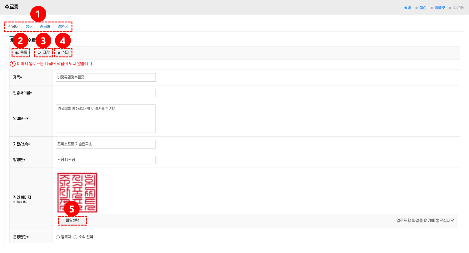 • 기관 직인 이미지를 업로드하여 수료증에 표시한다.