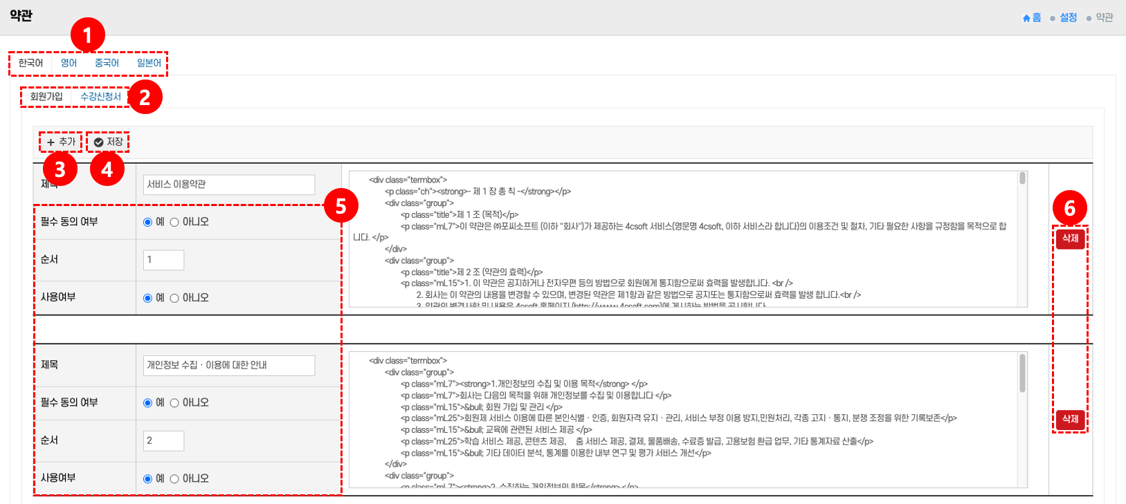• 삭제: 불필요한 약관의 삭제 버튼 ⑥ 클릭 → 해당 항목이 목록에서 제거된다.
