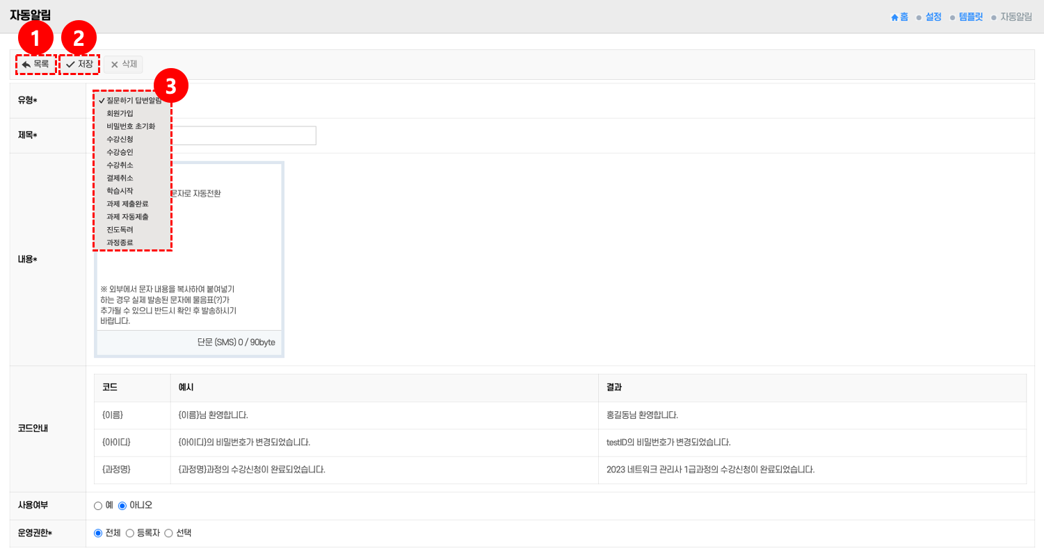 - 유형: 유형 드롭다운 ③ 클릭 → 회원가입, 비밀번호 초기화, 수강신청 등 원하는 유형을 선택한다.
