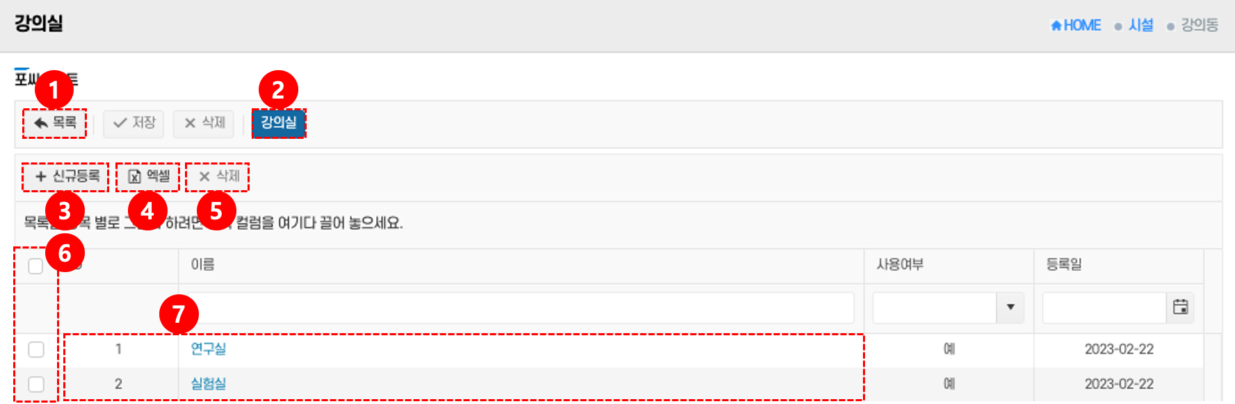 • 체크박스: 강의실 목록의 체크박스 ⑥을 선택 → 개별 또는 다중 선택 가능 → 삭제 버튼이 활성화된다.