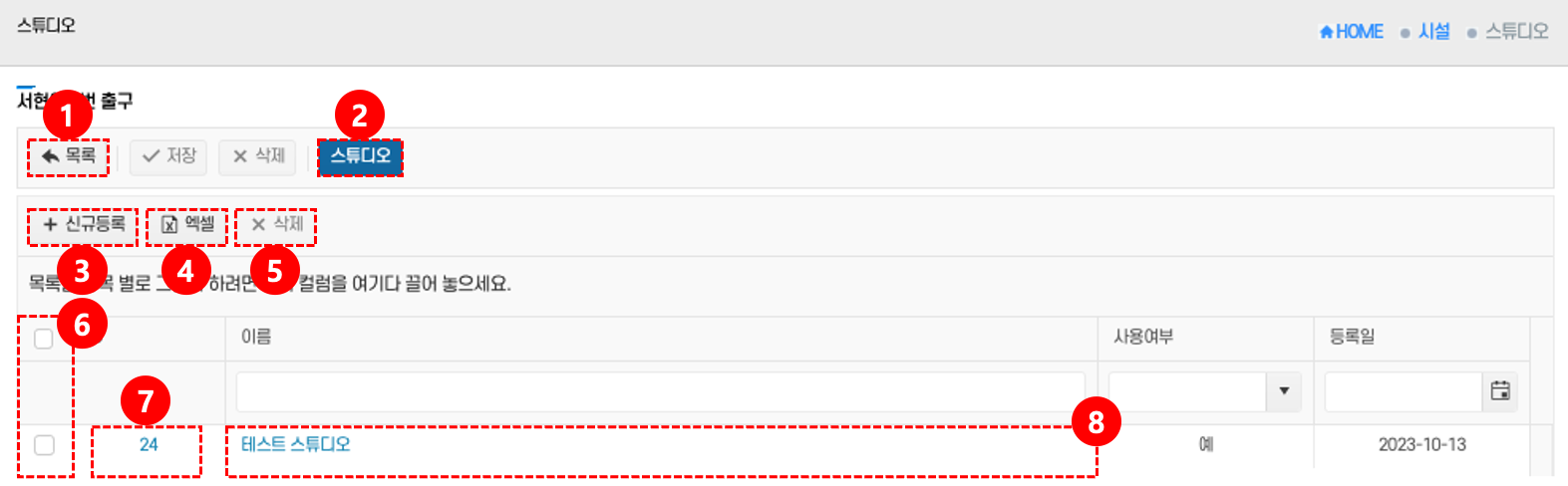 - 삭제: 삭제할 스튜디오를 체크박스 ⑥로 선택 → 상단의 삭제 버튼 ⑤를 클릭 → 삭제된다.