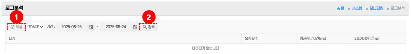 - 엑셀 다운로드: 상단의 엑셀 버튼 ①을 클릭 → 로그분석 데이터를 파일로 저장한다.