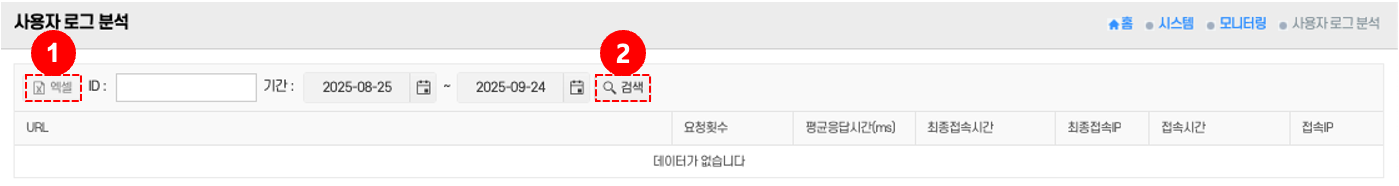 - 검색: 사용자 ID 및 기간 입력 후 검색 버튼 ② 클릭 → 해당 조건의 로그 내역을 조회한다.