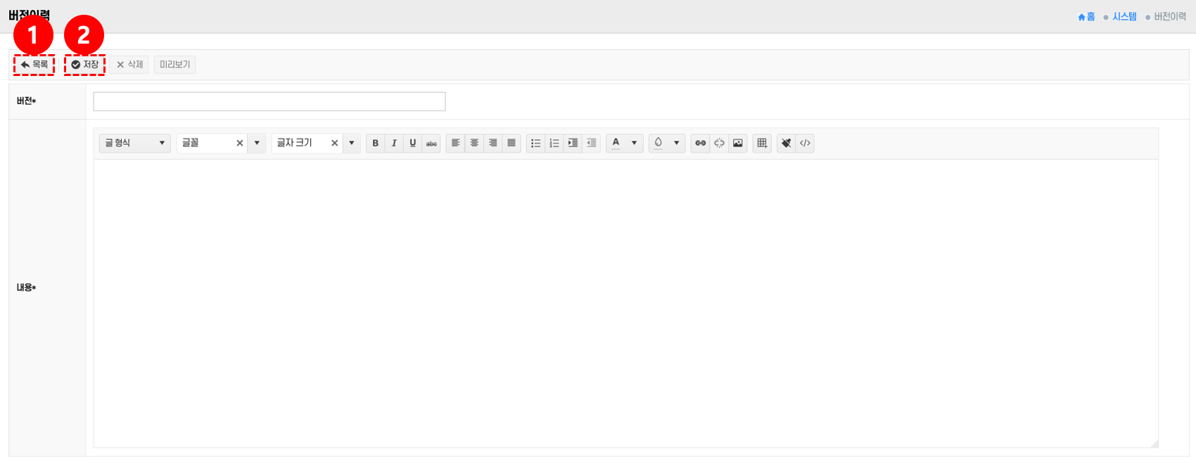- 저장: 버전명과 내용을 작성한 후 저장 버튼 ②을 클릭 → 새로운 버전이력이 등록된다.