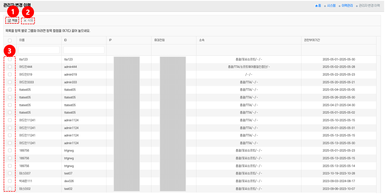 - 선택한 관리자 변경 이력 데이터를 삭제한다.