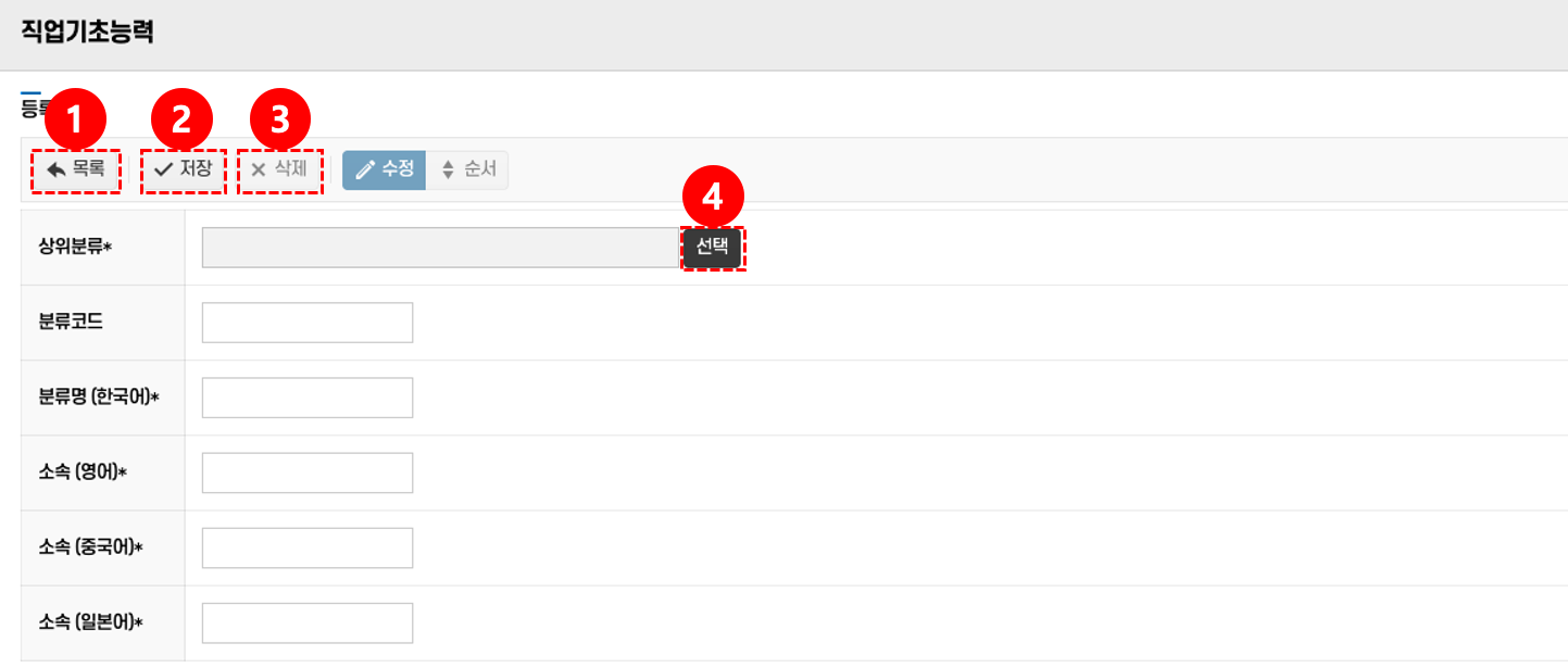 • 저장: 신규 직업기초능력 분류명과 소속 정보를 입력 후 저장 버튼 ② 클릭한다.
