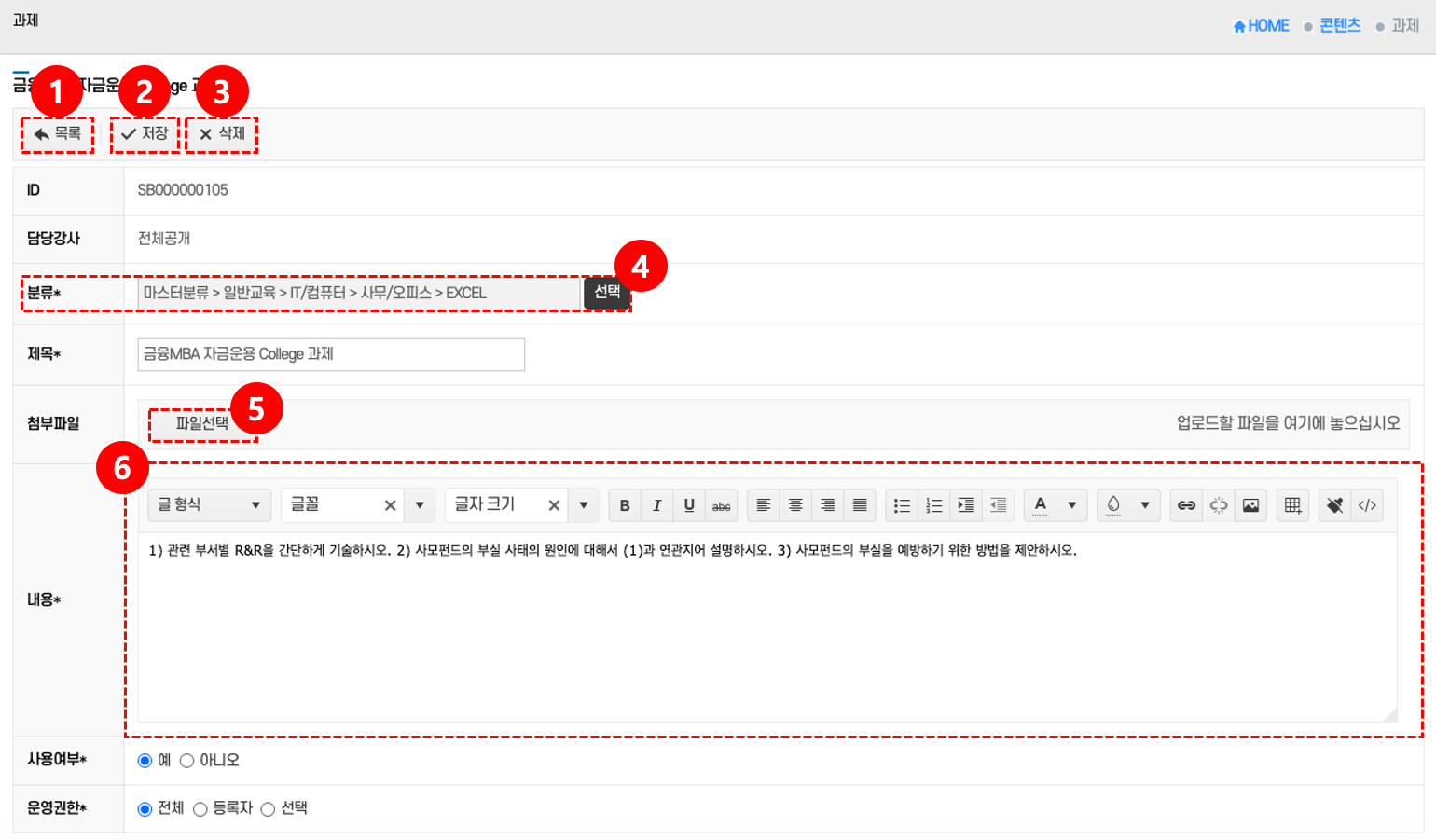- 내용 작성/편집: 과제 설명을 입력할 때 내용 편집 영역 ⑥을 활용하여 글자 서식, 표, 이미지 등을 삽입한다.