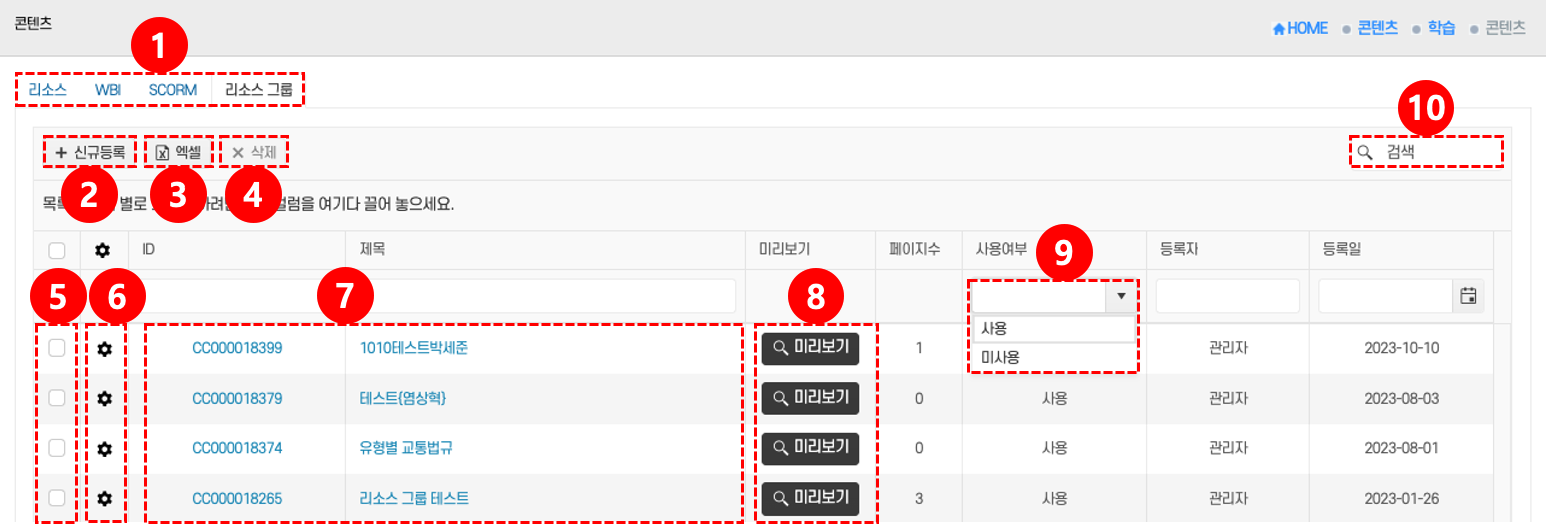 • 탭: 리소스, WBI, SCORM, 리소스 그룹
