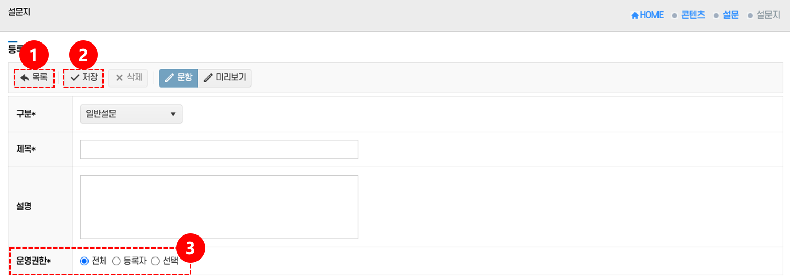 - 운영권한 설정: 설문지 접근 권한을 지정하려면 운영권한 설정 ③에서 전체, 등록자, 선택 중 하나를 선택한다.