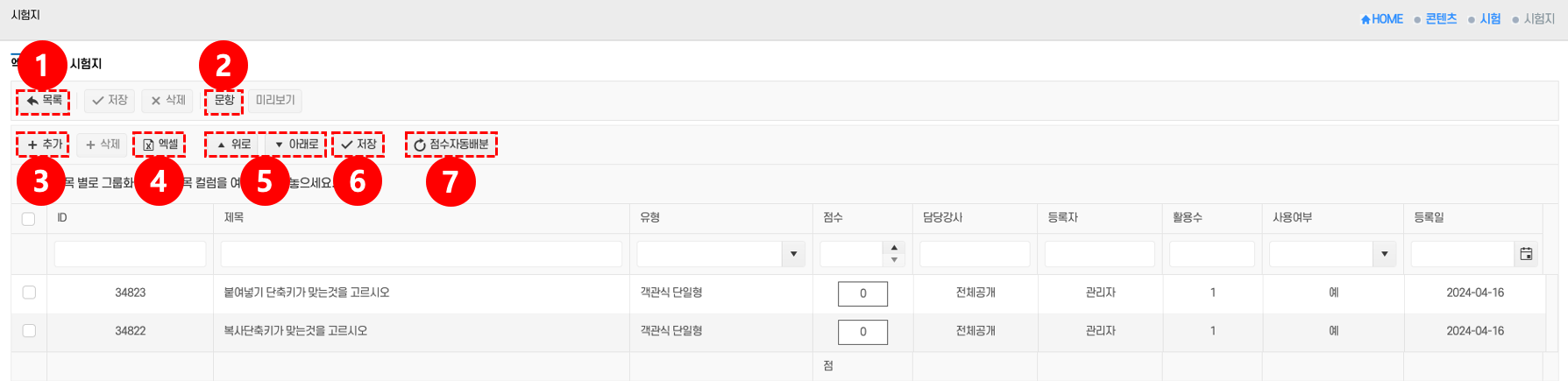 - 목록: 상단의 목록 버튼 ①을 클릭하면 시험지 목록 화면으로 돌아간다.