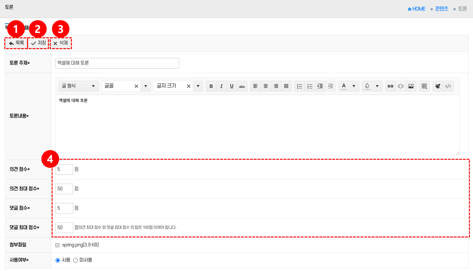 - 저장: 작성한 토론 주제와 내용을 저장하려면 저장 버튼 ②를 클릭한다.